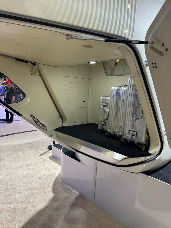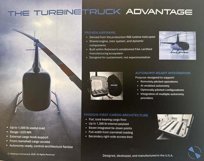 • Le R66 TurbineTruck : Une véritable bête de somme (qui arborait fièrement les marquages de ses partenaires technologiques Sikorsky Matrix et Rotor AI sur son fuselage). Fini les sièges, place à un plancher plat capable de supporter plus de 1 500 lbs (680 kg) de charge utile interne (1 300 lbs) ou au crochet. Son autonomie dépasse les 325 NM (3.3 heures). Il est équipé de doubles portes en coquille (clamshell) à l’avant pour un chargement aisé de la soute.