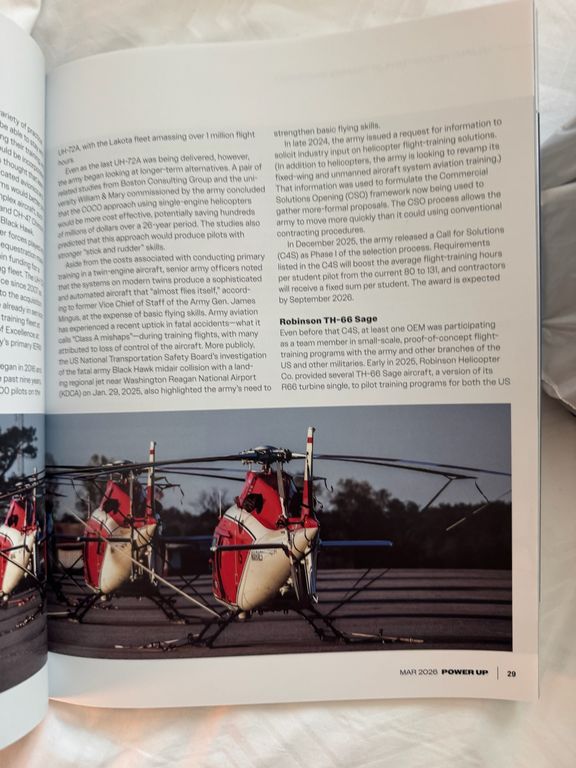 • La feuille de route R66 et l’influence militaire : L’année 2026 est charnière. Robinson a confirmé être en pleine réflexion concernant le développement d’un futur R66 IFR. Cette évolution majeure n’est pas le fruit du hasard : c’est l’US Army qui pousse le constructeur dans cette direction. Dans le cadre de son nouveau programme de formation (FSN), l’armée américaine exige un hélicoptère monoturbine capable de former ses pilotes aux vols aux instruments (via la variante militaire TH-66 Sage). Cette exigence tactique va directement profiter au marché civil en accélérant l’arrivée d’un R66 IFR ultra-compétitif. En parallèle, le travail de certification FAA pour le très attendu R66 NXG suit son cours.